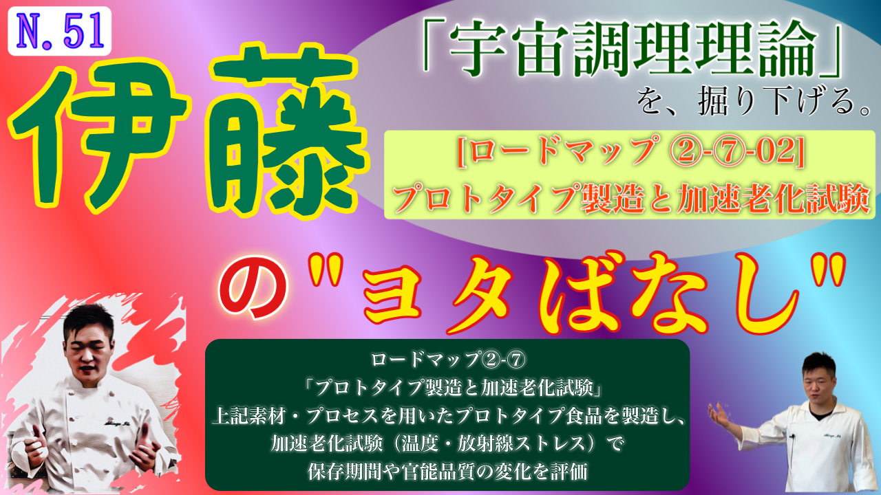 :上記素材・プロセスを用いたプロトタイプ食品を製造し、加速老化試験(温度・放射線ストレス)で保存期間や官能品質の変化を評価。」